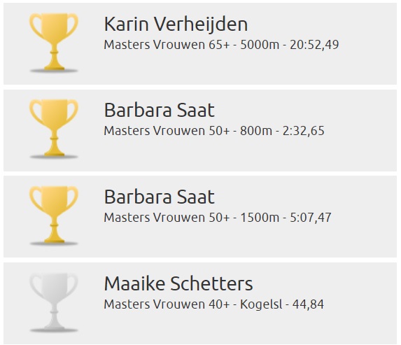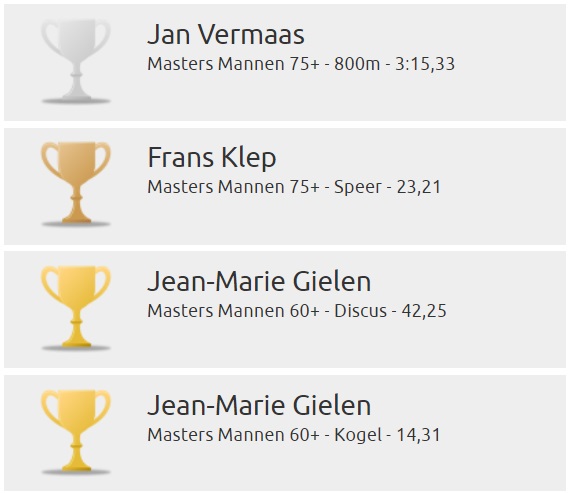 De tijd van 20.52,49, waarmee Karin Verheijden de 5000m won bij de V65, was zelfs een Nederlands record. Jean-Marie Gielen bleef met zijn 14,31 bij het kogelstoten M60 slechts 4 cm onder het Nederlands record.