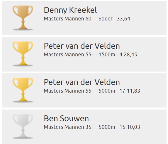 Dubbele titels waren er ook voor Barbara Saat (V50) die zowel de 1500m als de 800m won en voor Peter van der Velden (M55) die na de 1500m ook de 5000m op zijn naam schreef.