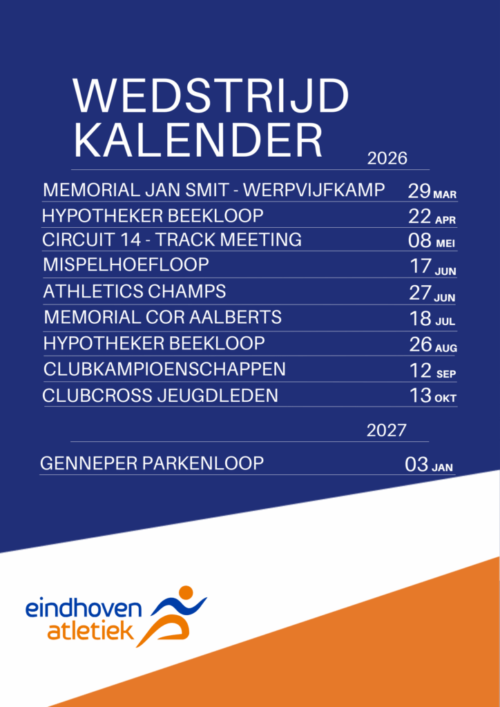 Wedstrijdkalender Wedstrijdkalender Eindhoven AtletiekDe data van de Eindhovense atletiek- en hardloopwedstrijden in 2026 zijn bekend. Zet ze in de agenda, we hopen vele EA-tenues te zien schitteren!Wedstrijd Organisatie Commissie (WOC) Lees meer artikelen Vorig berichtNieuwsflits maart 2026 Volgend berichtIngeschreven voor Marathon Eindhoven? Train dan vanaf 9 mei met ons mee! Dit vind je vast ook leuk Fotowedstrijd – Clubkleding in vreemde oorden 6 november 2025 70e editie van de Hypotheker-Beekloop 29 april 2024 AFTER MARATHON PARTY 15 OKTOBER 30 september 2024